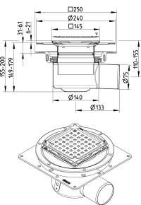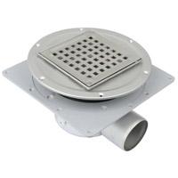 BLÜCHER Domestic-150 justerbar afløb for indbygning i svalehaleplader og for beton- og klinkegulve, med vandret Ø75mm udløb, med membranflange