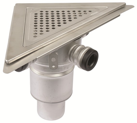 JUSTERBART BOLIGAFLØB TRIO - Med sideindløb, hjørne - Gulv: beton og fliser - Smøremembran, Ramme: trekantet - Udløb: Ø75mm, lodret - Rustfrit stål: AISI304/EN1.4301
