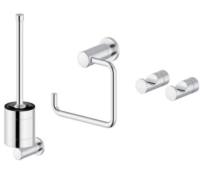 Du får en flot strømlinet, væghængt toiletbørste med udskifteligt hoved, enkel toiletpapirholder og 2 håndklædekroge.