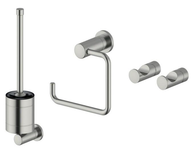Du får en flot strømlinet, væghængt toiletbørste med udskifteligt hoved, enkel toiletpapirholder og 2 håndklædekroge.