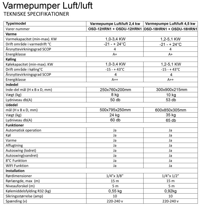 Langå varmepumpe luft til luft 3,4 kw med WiFi