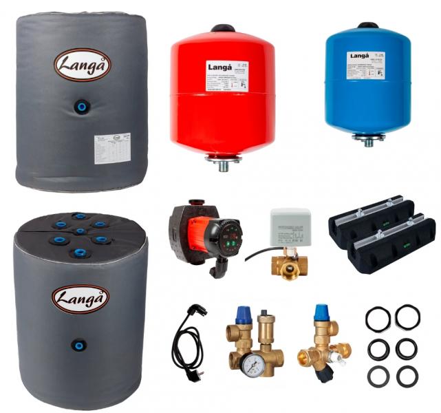 Pakke med alt tilbehør der skal bruges til en komplet installation med brugsvand. Der er valgt mindre tanke for at spare på pladsen.