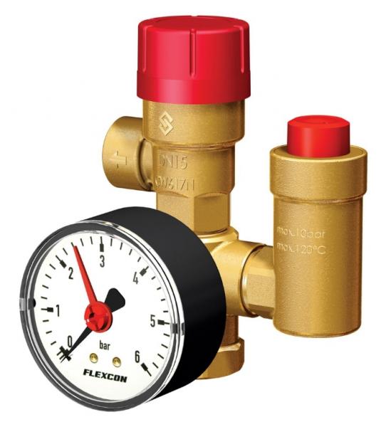 Flexcon komplet samlesæt 3/4X1/2" til trykekspansion, med 1 stk. 3/8" luftudlader, 1 stk. 1/4" manometer, 2,5 bar sikkerhedsventiler.