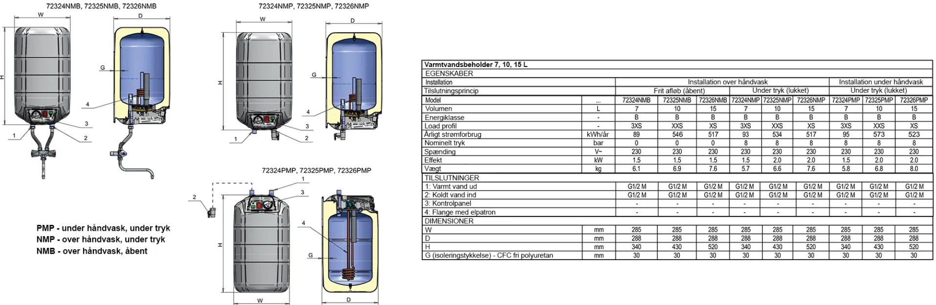 Eldom Varmtvandsbeholder 7 L - Til ophængning under håndvask Effektiv varmtvandsbeholder / vandvarmer til under håndvasken, fra ELDOMINVEST Hurtig og nem installation, dog må den kun udføres af autoriseret installatør. En ideel varmtvandsbeholder til rum uden indlagt varmt vand eller til yderligere opvarmning af forvarmet vand, f.eks. fra 30 °C vand fra buffertank, til 65 °C vand til opvasken. Vandvarmeren er isoleret med 30mm miljøvenligt (CPC fri) polyurethanskum. Det sikrer minimalt varmetab og derved energibesparelser. Beholderen er emaljeret og rustbeskyttet for at sikre lang holdbarhed. Vi anbefaler tilkøb af sikkerhedsamatur - 8 bar til alle varmtvandsbeholdere.