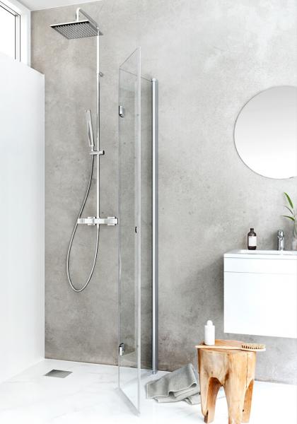 Hurtigt monteret, svingbar, lige brusedør med integreret håndtag, der foldes på midten for at optage minimal plads. Limede profiler og nem at installere og justere takket være teknikken InstaQuick™.