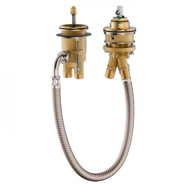 Indbygningsdelen til et 2-huls armatur til karkant til et 1-grebs armatur skaber den perfekte basis for en funktionssikker og permanent æstetisk integration af et 2-huls 1-grebs armatur i karkanten. Den er egnet til brug sammen med en kartud, der er længere væk. Den keramiske kartusche i bedste kvalitet fra hansgrohe sørger for en pålidelig og langvarig funktion.