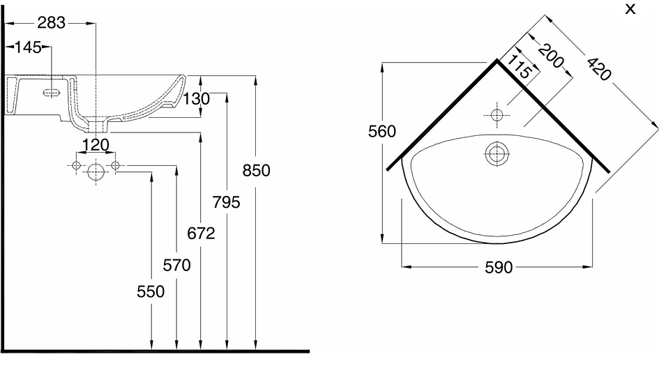 Ifö hjørnevask 500 x 500 mm - fremspring 560 mm og bredde 590 mm. Til boltemontering.