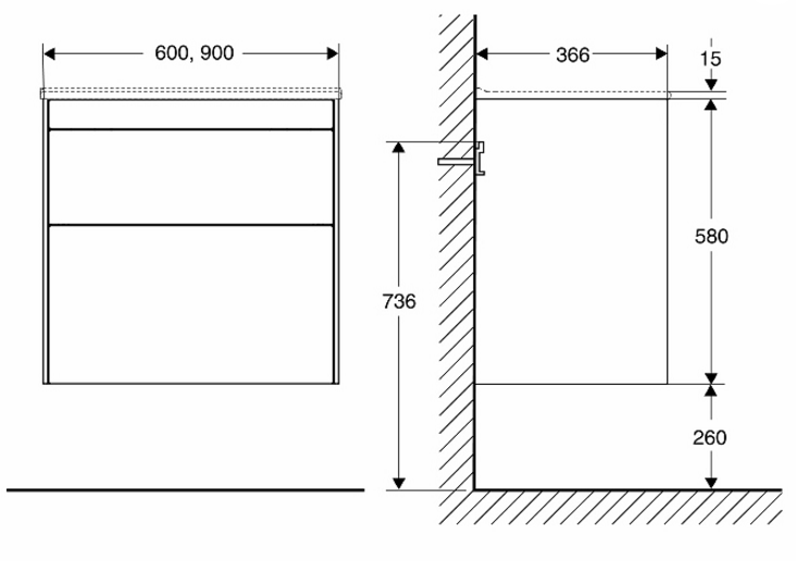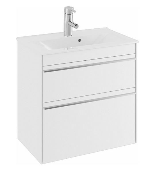 Komplet møbelpakke med smallere underskab, hvid. To softclose lukkende skuffer og Ifö Sense håndvask. Inklusiv hylde, forberedt for VVS-installation uden extra udskæring. Lige greb i aluminium indgår. Indretningspakke, vandlås og justerbare ophængningsbeslag indgår. Håndvasken har god afstillingsplads og forhøjet bagkant. Blandingsbatteri indgår ikke. Mått: H: 595 B: 600 D: 366 |