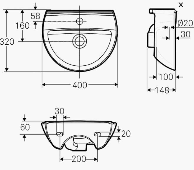 Håndvask med afsætningsplads på bagerste del af vasken. Monteres med bolte.