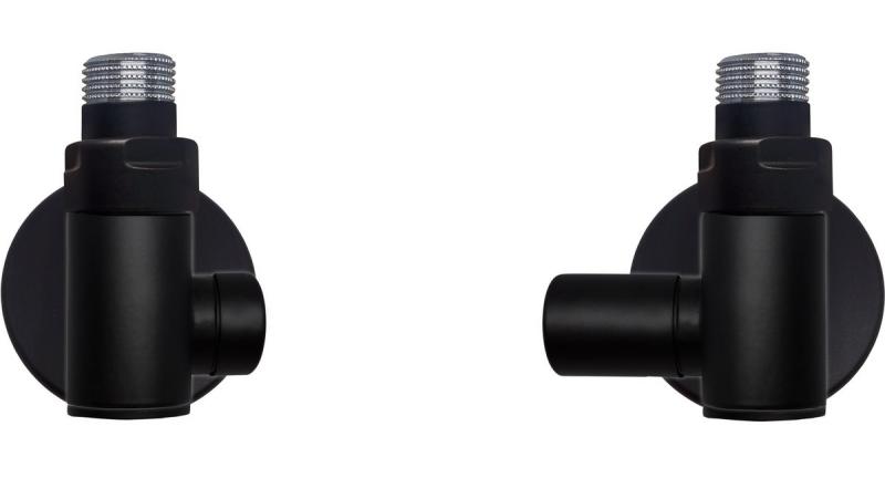 KRISS Corner Combi Manuel, ½” vinkelløbende hjørneventilsæt til kombineret central- og elvarme med manuel regulering, lakeret matsort (RAL9005). Ventilsættet er inkl. ½” tilslutningsrør og rosetter. Fremløb i højre side. Regulering skal sidde i højre side. Ikke vendbar.