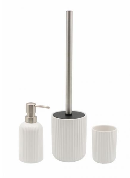 Nortiq tilbehørssæt til bad - Mat hvid Nortiq badeværelsessæt skaber en helhed på badeværelset. Sættet består af matchende sæbedispenser, tandkrus og toiletbørsteholder, der tilsammen formår at binde rummet sammen. Produkterne er lavet af keramik og har en flot mat hvid. På trods af sættes enkelthed og simple design, så giver den riflede overflade et særegent udtryk, der pynter på badeværelset. Sæbedispenseren kan genopfyldes med flydende sæbe, og dens pumpehoved er af børstet aluminium. Derudover kan toiletbørstehovedet udskiftes for at opretholde en optimal hygiejne. Toiletbørstens håndtag er produceret af rustfrit stål.