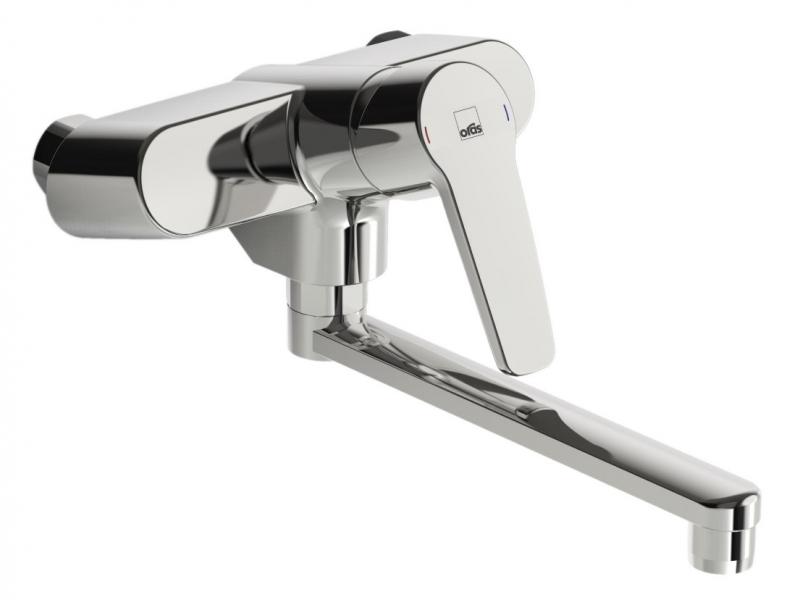 Vægarmatur med svingtud (200 mm). Mulighed for begrænsning af temperatur og vandmængde. |