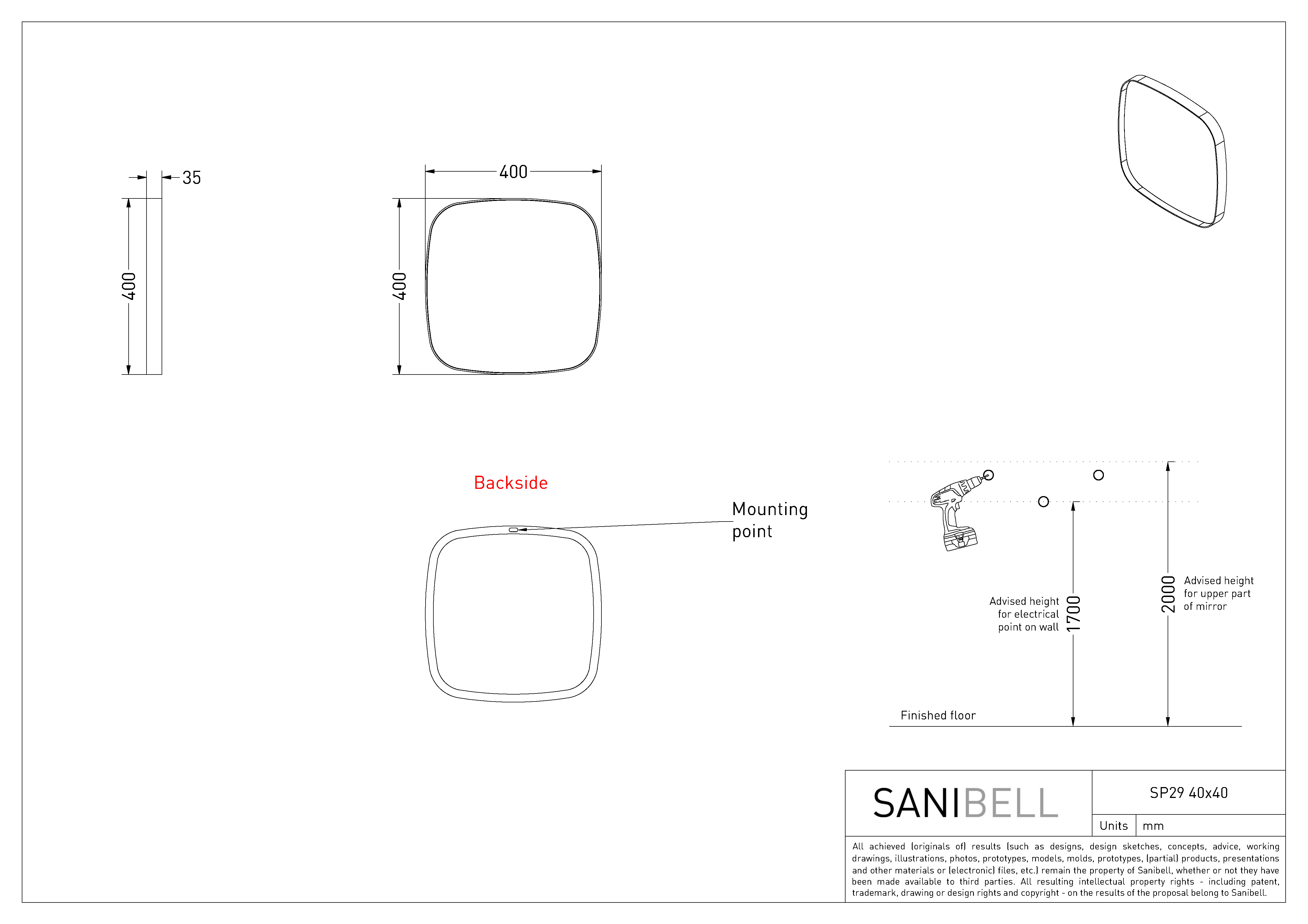 Minimalistisk spejl med ramme, som forfra er helt slank, men fra siden træder frem fra spejlets profil. Formen er superellipse og dermed ikke helt rund, og ikke helt firkantet.