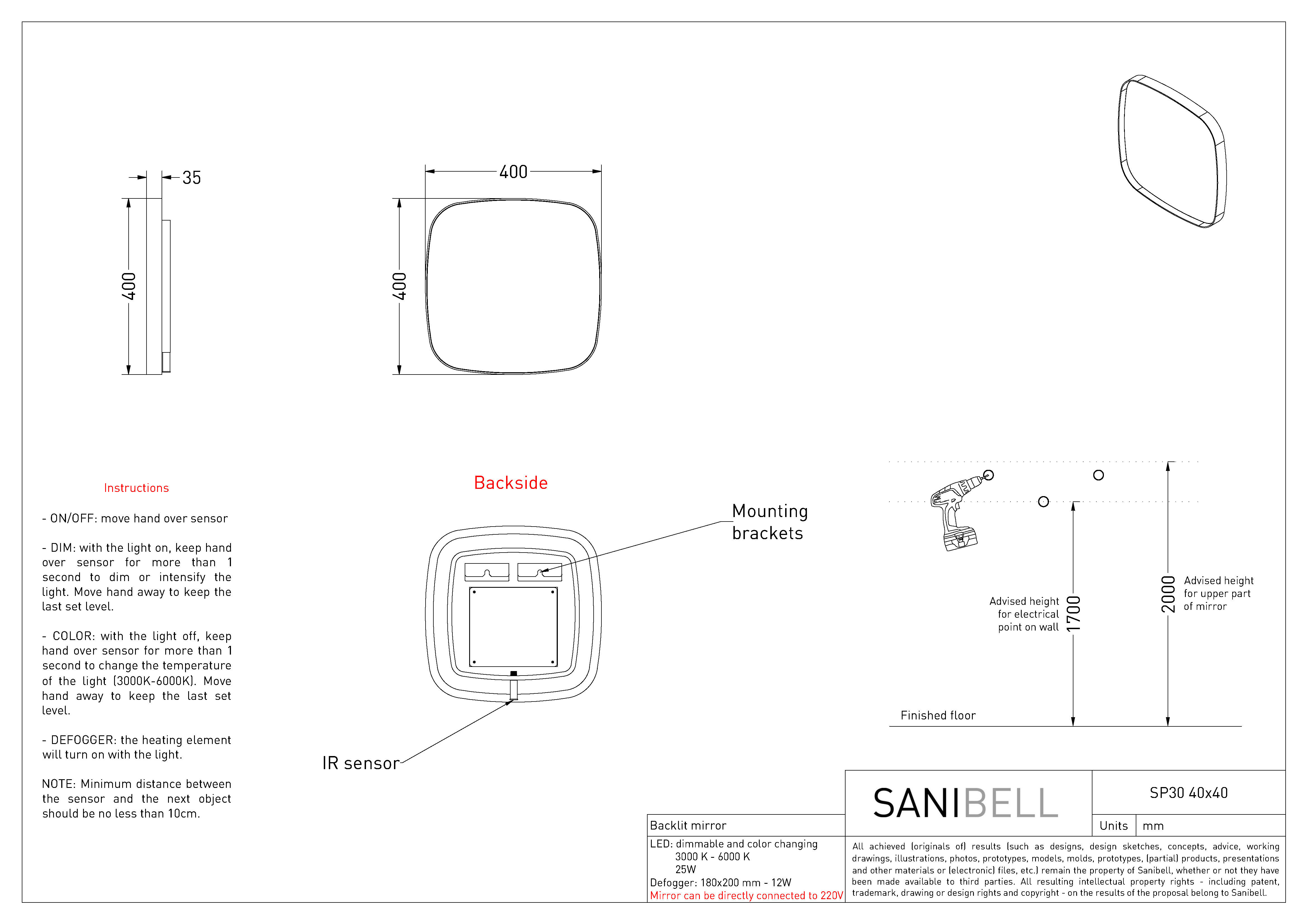 Sanibell Ink SP30 superellipse spejl m/backlight, varme og sensor 40 x 40 cm - Mat hvid