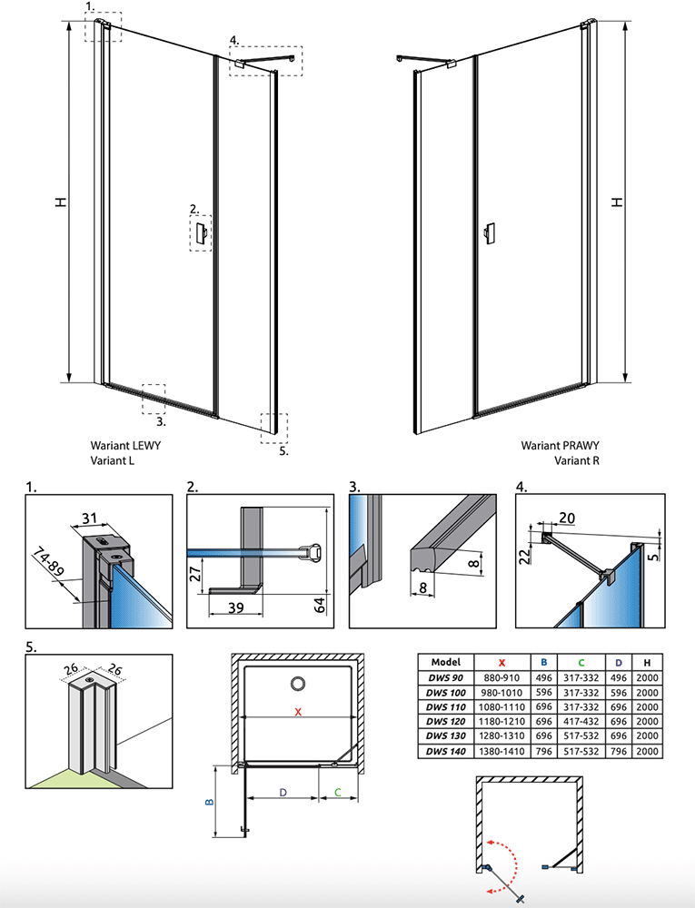 • Fastvæg over 400mm leveres med stabiliseringsstang