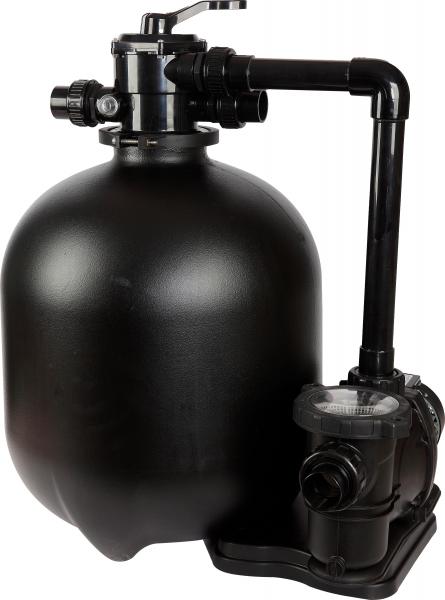 Med systemet følger en kraftig pumpe som er afpasset i kapacitet til filtertankens størrelse og den poolvolume der er angivet i specifikationerne nedenfor. Pumpen skal have kraft nok til at kunne cirkulere alt poolvandet 5 gange i døgnet - vel at mærke igennem filtermaterialet. Som tommelfingerregel skal pumpens rensningskapacitet være minimum poolens vandvolumen delt med 5. Pumpen kan benyttes med saltvand.