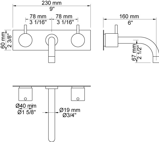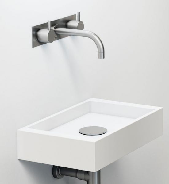 Vola 1513K håndvaskbatteri. To-grebsblander med keramiske ventiler, 1500, fast tud med vandbesparende luftindblander, 010, tre-hulsplade 60 x 230 mm, 003K.