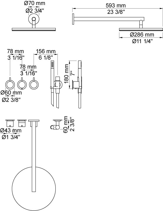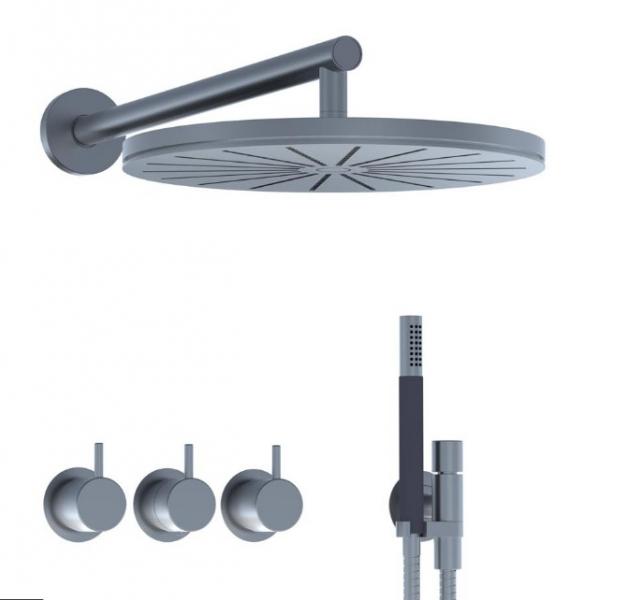 Indbygningstermostat ¾'' med omskifter T2 Håndbruser med metalslange og holder Hovedbruser, rund, vægmonteret Separat udløb Rosetter Krom 16 3/4''RG/PEX
