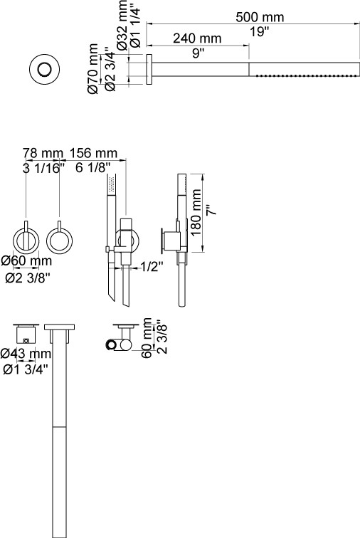Vola Et-grebsblander for stor vandmængde med keramisk ventilenhed og omskifter samt løs afgangsmuffer. T2 Håndbruser med metalslange og holder hovedbruser Rosetter Krom 16 ½''RG/PEX
