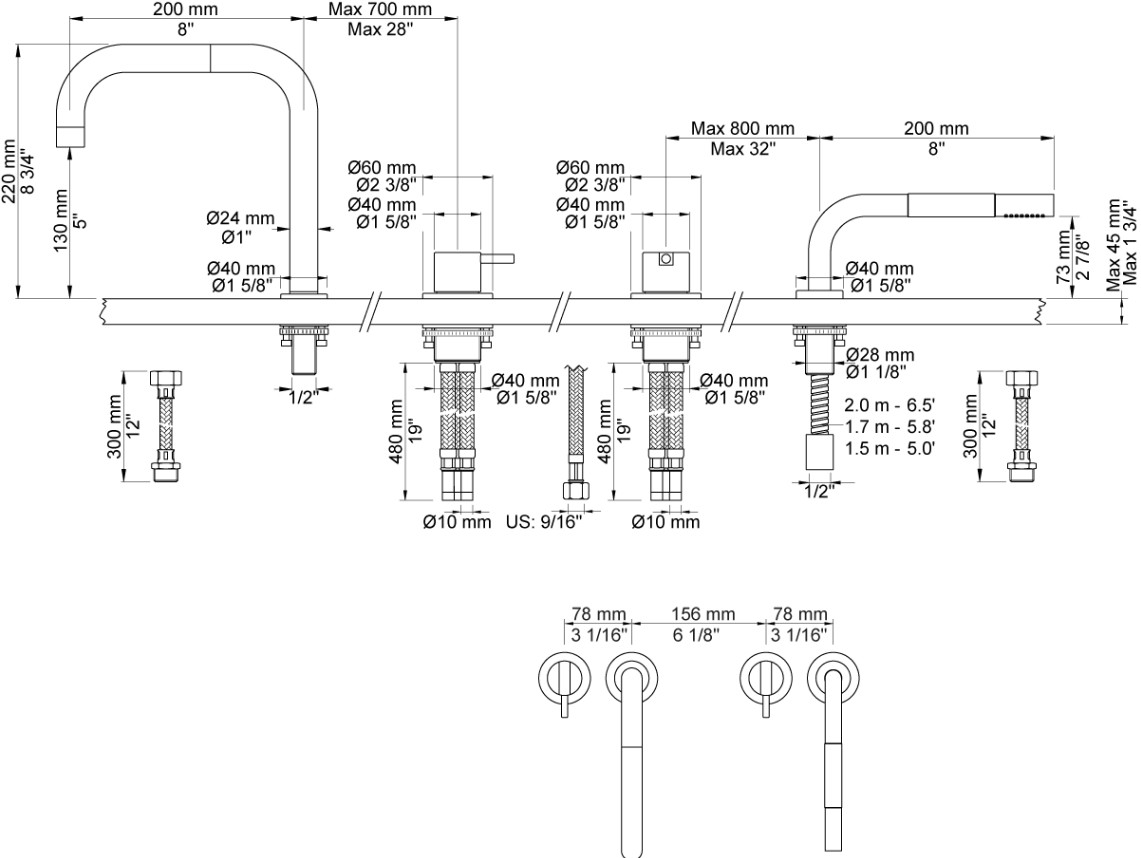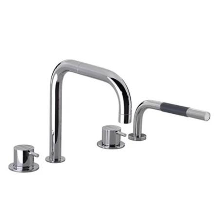 Vola Et-grebsblander SC10 med 360° dobbelt svingbar tud og et-grebsblander med håndbruser Dobbelt svingbar udløb, 200 mm, ø24 mm Krom 16 SPX