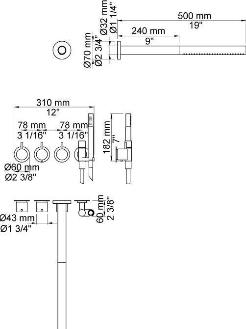 Vola Indbygningstermostat ¾'' med omskifter T2 håndbruser med metalslange og holder til højre hovedbruser Separat udløb Rosetter Krom 16 3/4''RG/PEX