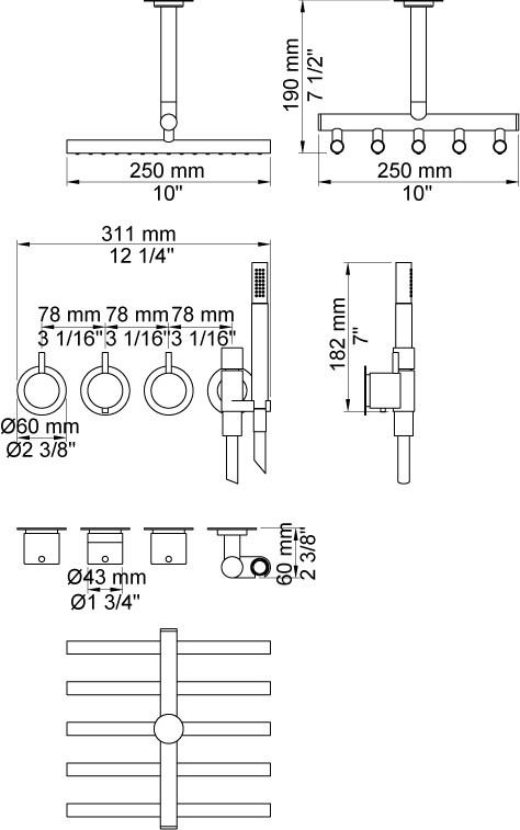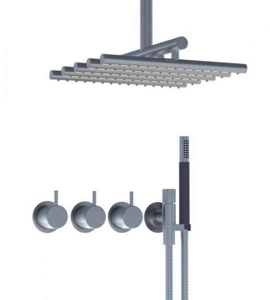 Vola Indbygningstermostat ¾'' med omskifter T2 håndbruser med metalslange og holder til højre Loftmonteret hovedbruser Separat udløb Rosetter Krom 16 3/4''RG/PEX
