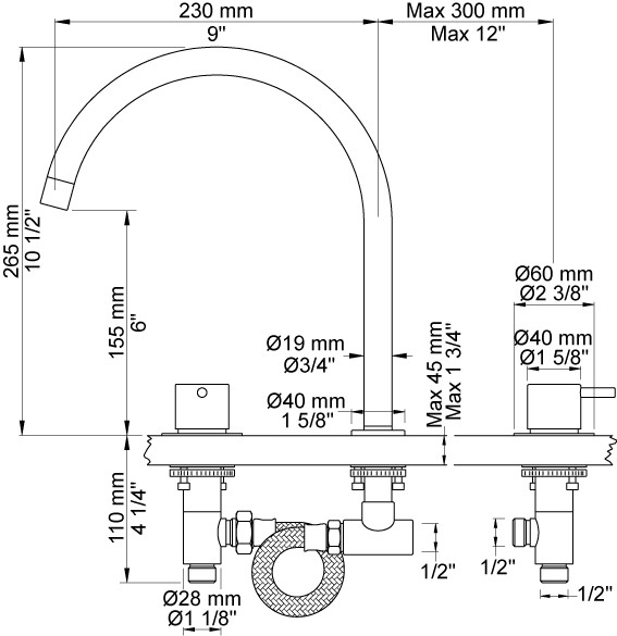 Vola To-grebsblander bestående af 2 stk keramiske stopventiler Svingbar udløb, udlæg 230 mm, ø19 mm Standard 25 mm Rosetter Krom 16 ½''RG
