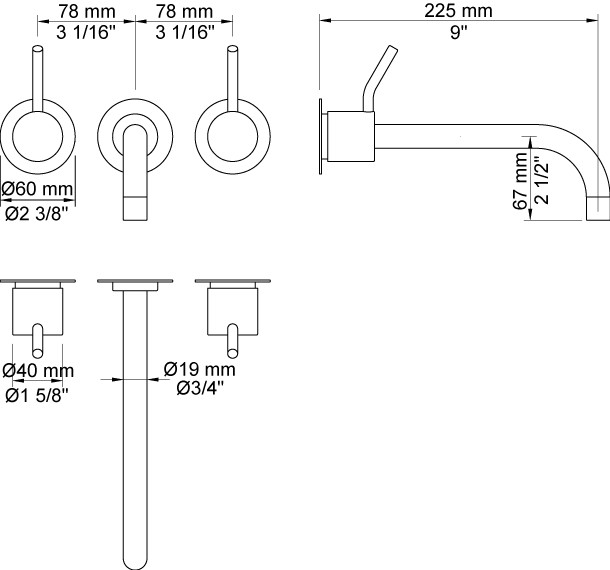 Vola To-grebsblander med afgangsmuffe i midten Fast udløb, 225 mm, ø19 mm Mellemlangt 60 mm Rosetter Krom 16 ½''RG/PEX
