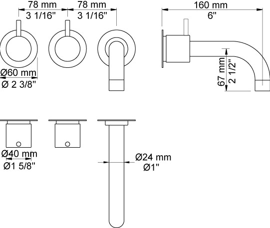 Vola To-grebsblander med keramiske ventiler, Standard 25 mm Fast udløb, 160 mm, ø24 mm Standard 25 mm Rosetter Krom 16 ½''RG/PEX OBS: Billedet viser armaturet i rustfrit stål. |