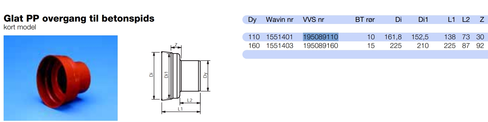 PP Overgang t/Betonspids 110 - 140 mm.