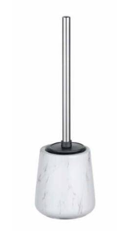 Wenko Adrada toiletbørste - Marmor keramik Den stilfulde Adrada toiletbørste udgør en attraktiv opbevaringsplads af toiletbørsten på badeværelset. Toiletbørsten er fritstående og placeres frit efter ønske, hvor den altid sikrer pålidelig brug med den hygiejnisk silikonebørste med non-stick effekt og udskifteligt, sort børstehoved med en diameter på 7,5 cm. Toiletbørsteholderen er dekorativ i det flotte marmordesign, som giver hvert badeværelse en særlig atmosfære. Den er fremstillet af højkvalitets keramik, der sikrer mange års brug grundet den gode kvalitet. Toiletbørsten har en simpel form med bløde former og afrundede kanter. I Adrada-serien findes også matchende tandbørstekrus, sæbedispenser og toiletsæt.